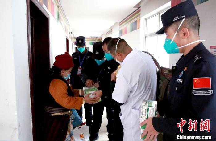 移民管理警察為駐地敬老院尼瑪頓珠老人解說腸胃藥的服用說明。 肖富貴 攝
