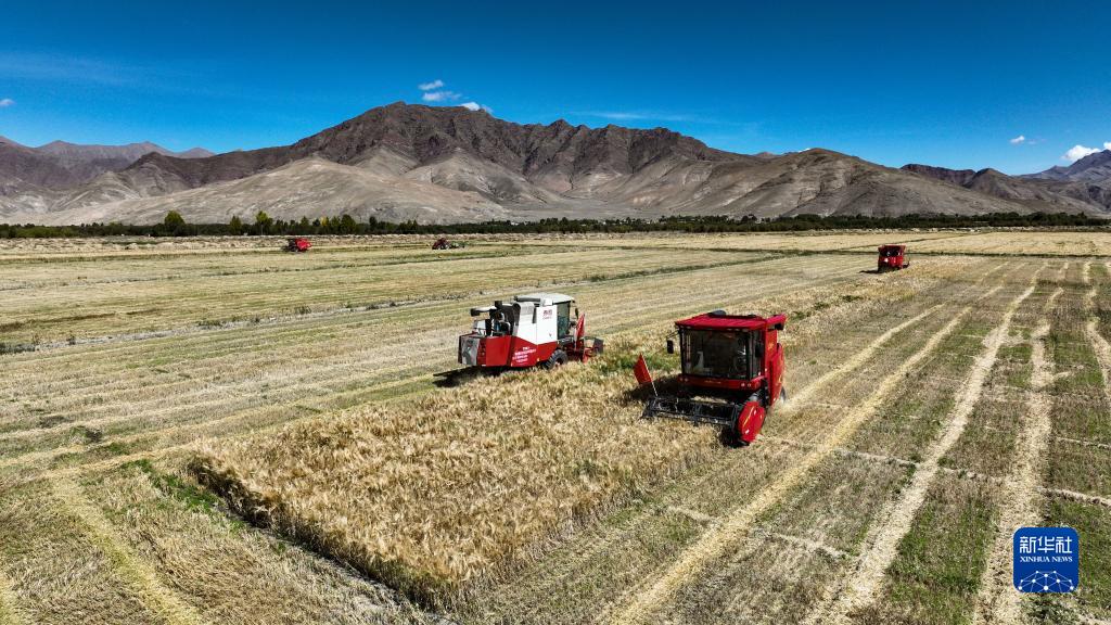 日喀則市江孜縣努康村村民在進(jìn)行機械化收割。新華社記者 晉美多吉攝