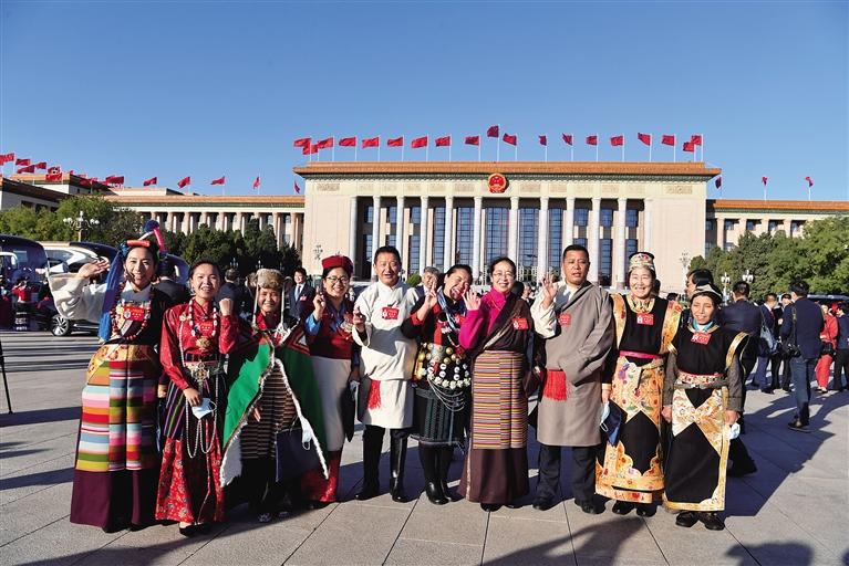 圖為閉幕會后,西藏基層代表在人民大會堂前合影留念。