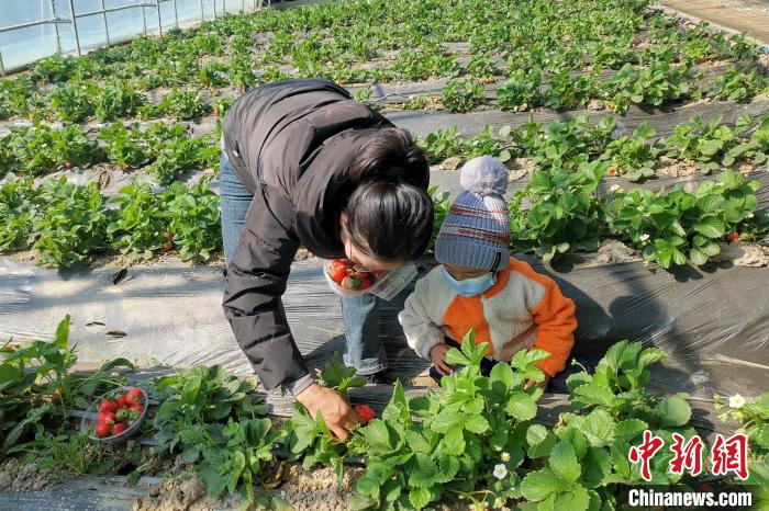 家長(zhǎng)帶孩子體驗(yàn)草莓采摘。 張玉祥 攝