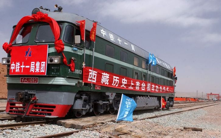 2004年3月23日,在海拔4704米的青藏鐵路海拔最高鋪架基地——西藏安多鋪架基地上,中鐵十一局1083號(hào)東風(fēng)4型內(nèi)燃機(jī)車向雪域高原緩緩駛來(lái)。這標(biāo)志著西藏歷史上出現(xiàn)了第一臺(tái)鐵路機(jī)車。