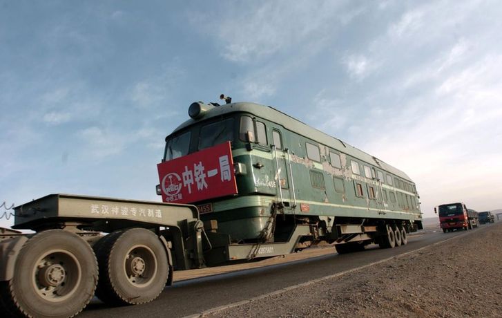 2005年4月19日,一輛汽車上裝著一輛機(jī)車,從青海省格爾木市秀水河車站經(jīng)過(guò)青藏公路向西藏安多方向行駛。青藏鐵路建設(shè)總指揮部從2004年3月開(kāi)始陸續(xù)把近200臺(tái)機(jī)車、鋪軌機(jī)、架橋機(jī)、軌道車等大型鋪架設(shè)備用汽車從格爾木安全運(yùn)抵西藏安多,途中翻越海拔5231米的唐古拉山埡口,創(chuàng)造了鐵路建設(shè)史上的奇跡。