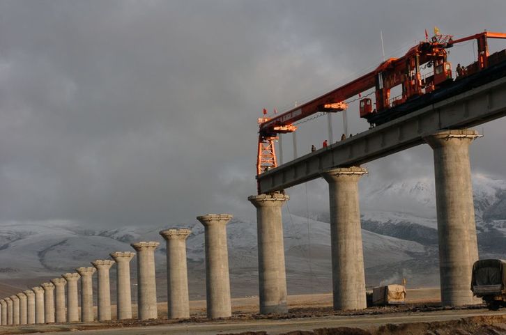 2004年10月1日,工人們正在架設(shè)青藏鐵路那曲以橋代路特大橋。