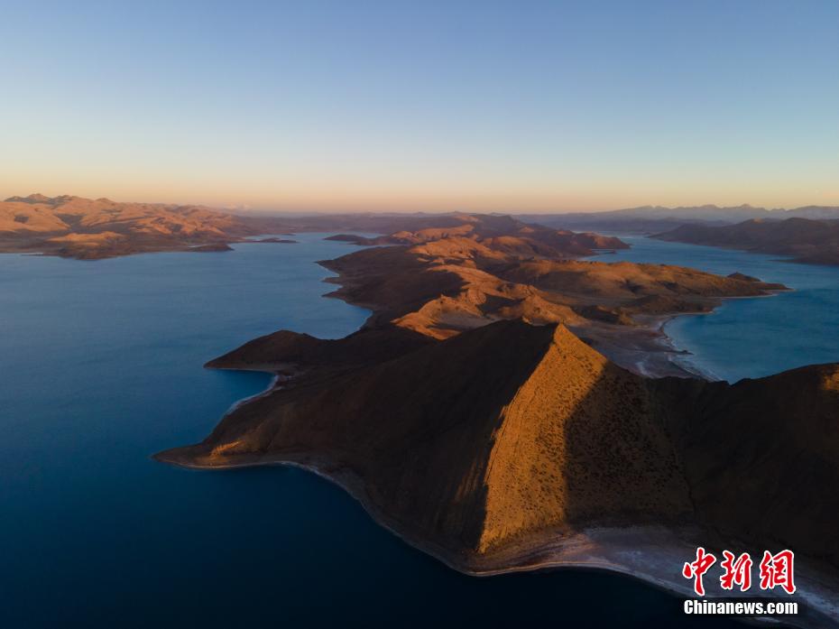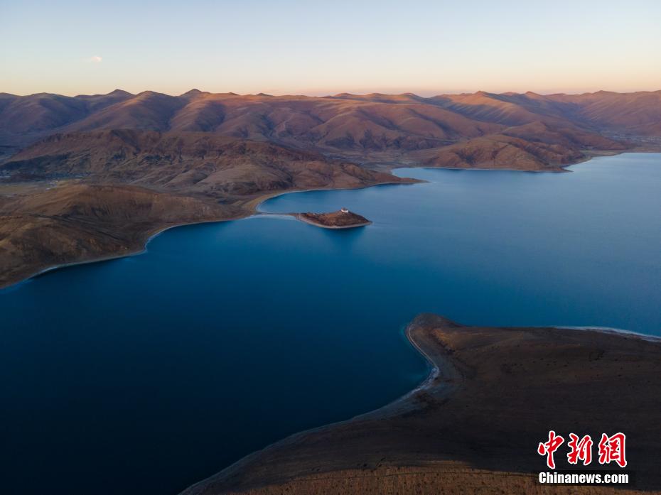 近日,西藏自治區(qū)山南市羊卓雍錯(cuò)(簡(jiǎn)稱(chēng)羊湖),冬日由于沒(méi)有云層遮擋,湖水更顯深藍(lán)、孔雀藍(lán)。航拍視角下,湖水像巨大的寶石鑲嵌于高原大地,風(fēng)光壯麗。羊卓雍錯(cuò)藏語(yǔ)意為“碧玉湖”,湖面海拔4441米,與納木錯(cuò)、瑪旁雍錯(cuò)并稱(chēng)西藏三大“圣湖”。圖為日落后的羊卓雍錯(cuò)風(fēng)光。 江飛波 攝