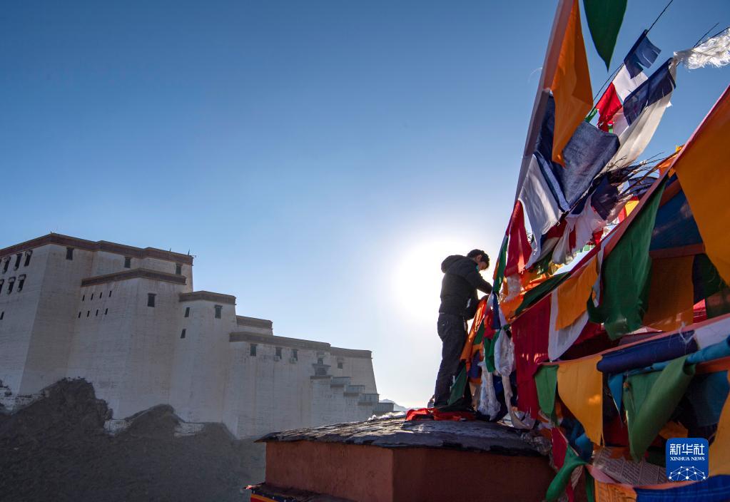 1月24日,日喀則市桑珠孜區(qū)的藏族群眾在懸掛五彩經(jīng)幡。新華社記者 孫非 攝