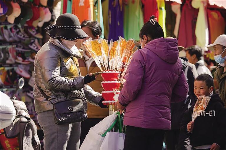 “市場現(xiàn)有1200多家商戶,經營商品有零食、蔬菜、肉類、干雜、五金、服裝等。藏歷新年臨近,每天前來置辦年貨的市民絡繹不絕,日均人流量超1萬。為保證藏歷新年期間年貨充足,市場商戶們提前籌備、積極備貨,目前,各類商品庫存充足、品種豐富,基本上能夠滿足不同消費者的需求?!睕_賽康商貿有限公司負責人尼瑪告訴記者。此外,沖賽康市場將于2月19日至27日暫停營業(yè),28日起正常營業(yè)。