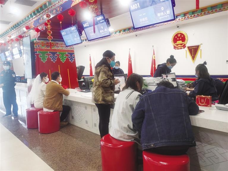 14日一大早,記者在拉薩三級政務(wù)服務(wù)大廳婚姻登記處看到,大廳里坐滿了前來登記領(lǐng)證的情侶,工作人員正在有序地為新人辦理證件。記者注意到,前來登記領(lǐng)證的新人或手捧鮮花,或頭戴白紗,或好友一路跟拍,臉上洋溢著幸福的笑容。為了營造浪漫的節(jié)日氛圍,婚姻登記處的工作人員也在大廳和禮堂內(nèi)精心擺放了寓意為“百年好合”的百合花。