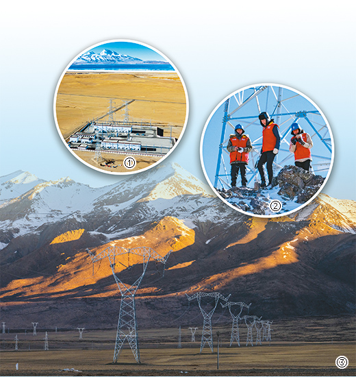 圖①:位于海拔4700多米的阿里聯(lián)網(wǎng)工程霍爾變電站。圖②:國(guó)網(wǎng)阿里公司工作人員正在巡檢線路。圖③:阿里地區(qū)的曠野上,電力鐵塔在夕陽(yáng)下熠熠生輝。(本文照片均為記者徐馭堯攝)