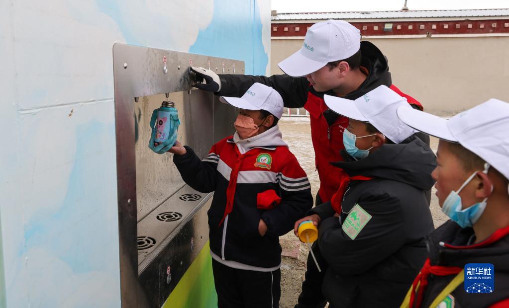 3月21日,那曲市色尼區(qū)香茂鄉(xiāng)小學(xué)的同學(xué)們?cè)谛聠⒂玫膬羲敬蛩?。新華社記者 姜帆 攝