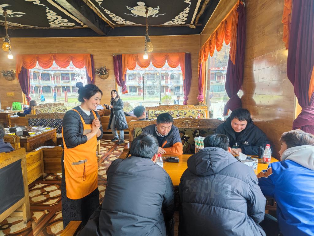 德吉旺姆(左一)正在農(nóng)莊招待前來就餐的游客(3月26日攝)。新華社記者王澤昊 攝