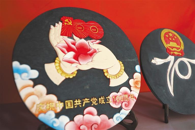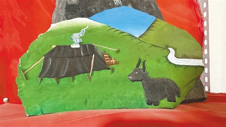 “我們首先要選好一塊石頭,根據(jù)它的形狀和質(zhì)地來決定刻成一幅什么樣的作品,然后再畫出作品的輪廓進(jìn)行雕刻,最后一步則為上色?!鄙V懿湃薀崆榈貛覀儏⒂^他的工作室,“慶祝中國(guó)共產(chǎn)黨成立100周年”“牧家生活”“扎西德勒”“白海螺”“和氣四瑞像”……每一幅作品活靈活現(xiàn)在大大小小石板上,栩栩如生、惟妙惟肖,堅(jiān)硬的石頭在他出神入化的雕工下竟變得柔軟,又不失力量和美感。