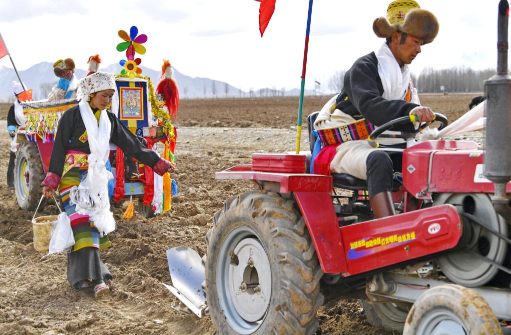 西藏拉薩市林周縣強(qiáng)嘎村的春耕儀式(3月16日攝)。新華社記者張汝鋒 攝