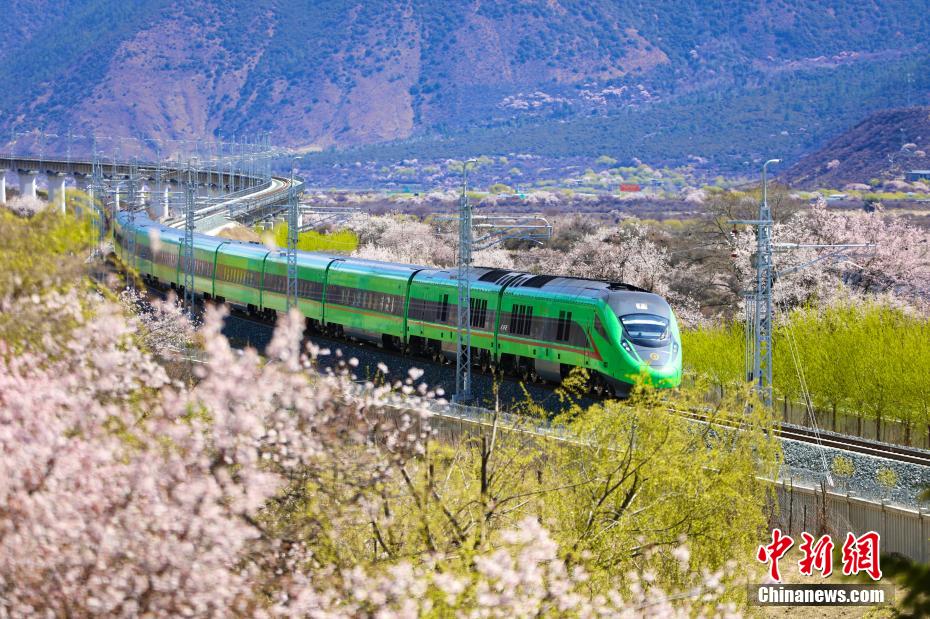 穿梭在桃花林中的拉林鐵路高原復(fù)興號(hào)。