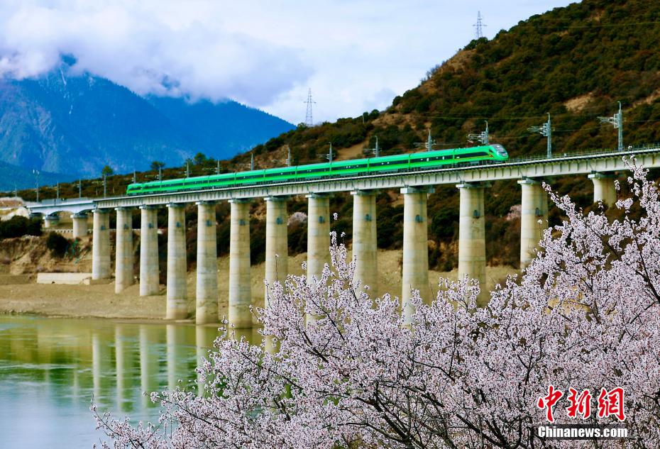 近日,中國(guó)鐵路青藏集團(tuán)有限公司介紹,3月下旬至4月,拉林鐵路沿線綿延的野生桃花林盛開(kāi),藍(lán)天、白云、桃花、雪山、高原復(fù)興號(hào)動(dòng)車等相互交織,形成了一幅幅美不勝收的畫面。圖為穿梭在桃花林中的拉林鐵路高原復(fù)興號(hào)。