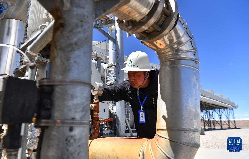 在海拔近4700米的現(xiàn)場,記者看到帶著高溫蒸汽的熱水從地下井口涌出,經(jīng)過設備分離,高溫高壓的蒸汽和熱水分別從兩個管道進入電廠。在這里,機器提取熱能用于發(fā)電,然后讓冷卻的尾水通過管道重新返回地下,形成全封閉循環(huán)再利用模式。