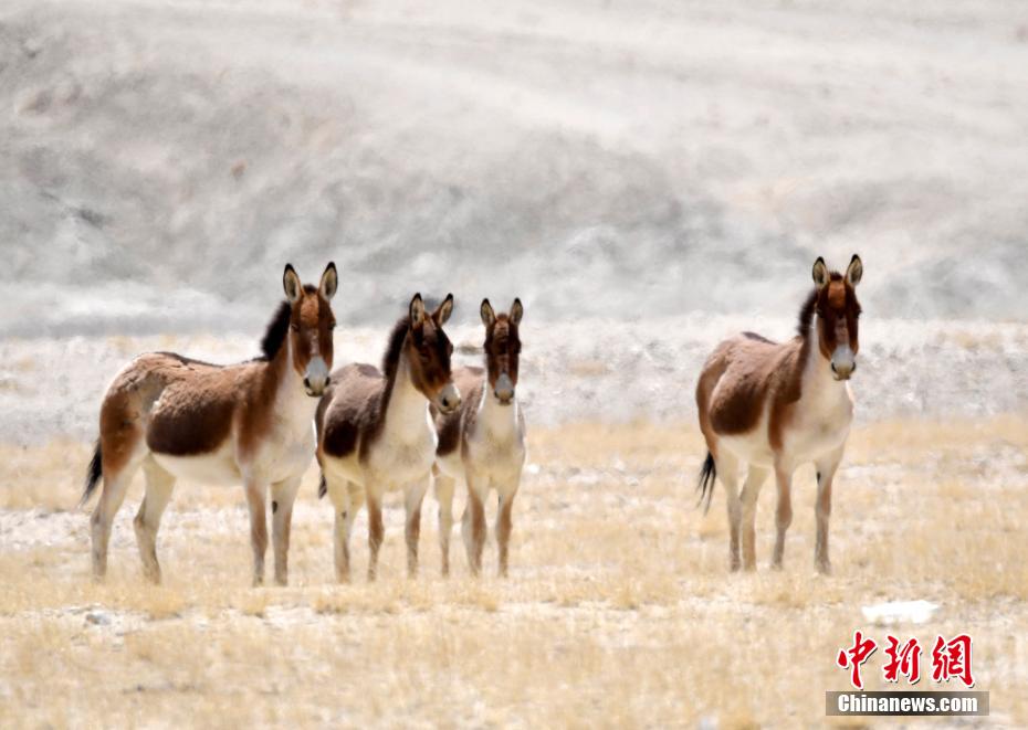 4月10日,西藏阿里地區(qū)札達縣拍攝到的藏野驢。藏野驢為國家一級重點保護動物、青藏高原特有物種。藏野驢是我國野驢中體型最大的一種,外形與蒙古野驢相似,但要比蒙古野驢大許多,而且性格也比蒙古野驢兇悍。它的四肢和身體下側,包括頸下方白色,耳朵內側和口鼻端也是白色。在背脊上,一條深色條紋從鬃毛處一直延伸到尾端,尾巴上有一簇黑色細絲狀的毛。近年來,隨著西藏生態(tài)保護力度不斷加大,藏野驢等多種野生動物頻頻亮相。
