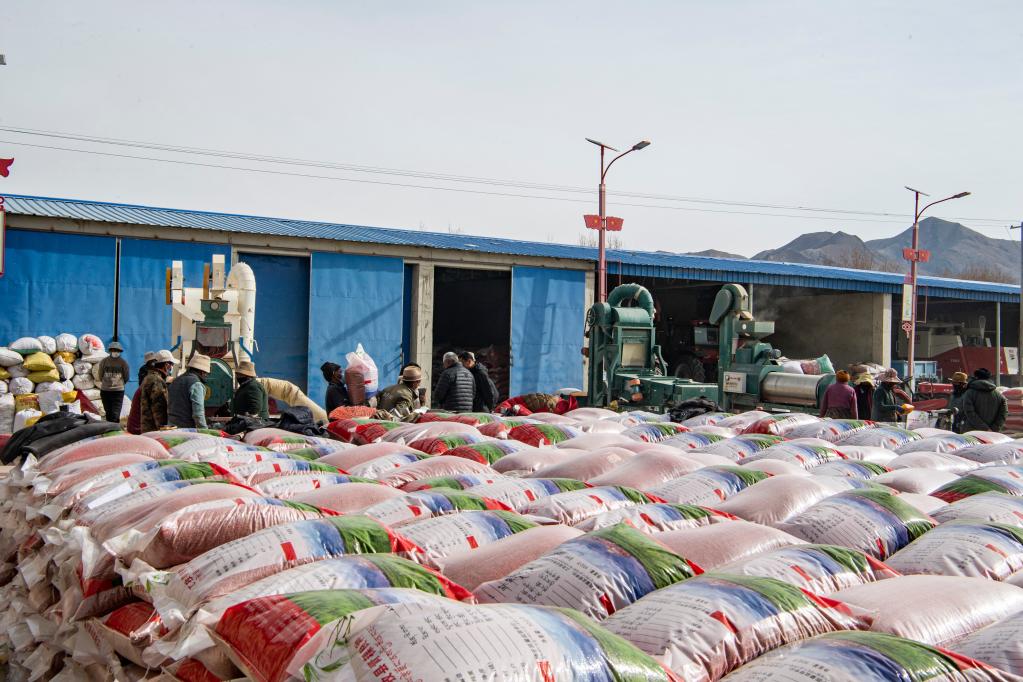 在西藏日喀則市江孜縣紫金鄉(xiāng)努堆村的農(nóng)機農(nóng)民專業(yè)合作社內(nèi),兩臺青稞種谷物精選機正開足馬力,給新收獲的青稞良種過篩、除雜、包衣、裝袋,50公斤一袋的青稞良種已碼滿大半個院子。