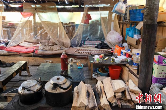 德瑪龍6號執(zhí)勤點(diǎn)木板房是大家在森林里的庇護(hù)所,進(jìn)入后可以看到房內(nèi)左右兩側(cè)布置了兩排通鋪,每人的床位由一個罩式蚊帳以及被褥組成,屋子中間有個藏式爐子,里面燒著并不干燥的木柴。