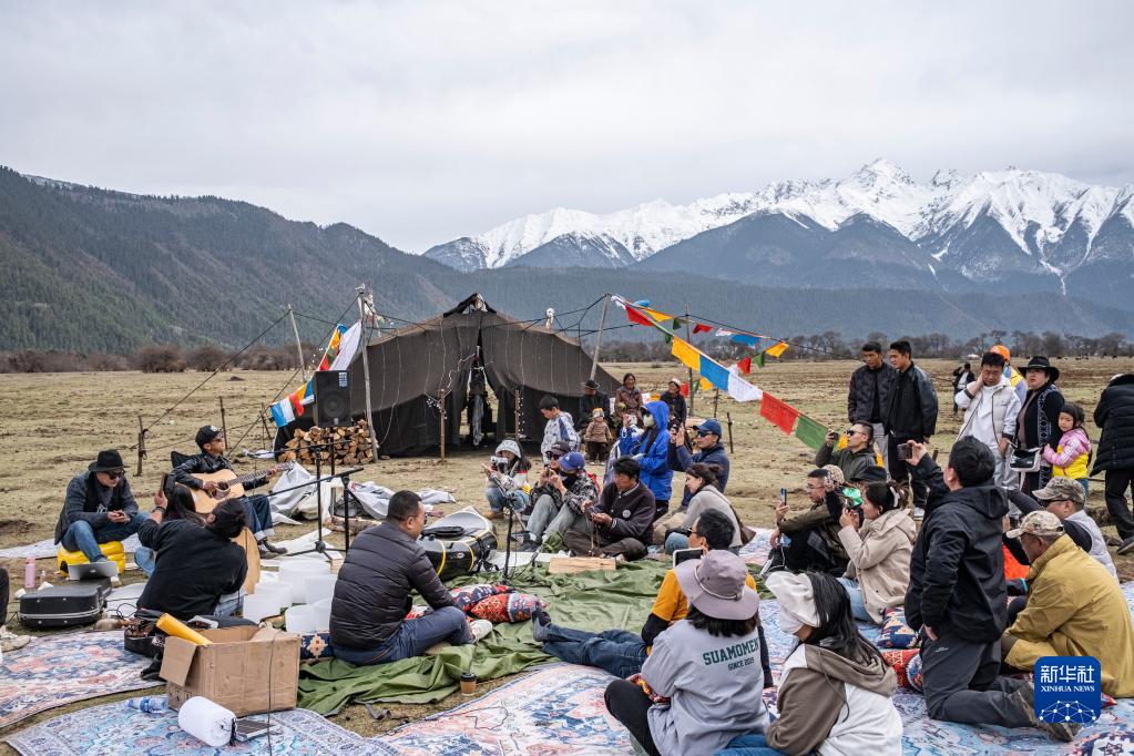 4月15日,在“巴松錯漂流露營大會”現(xiàn)場,游客在觀看文藝表演。新華社記者 曹檳 攝