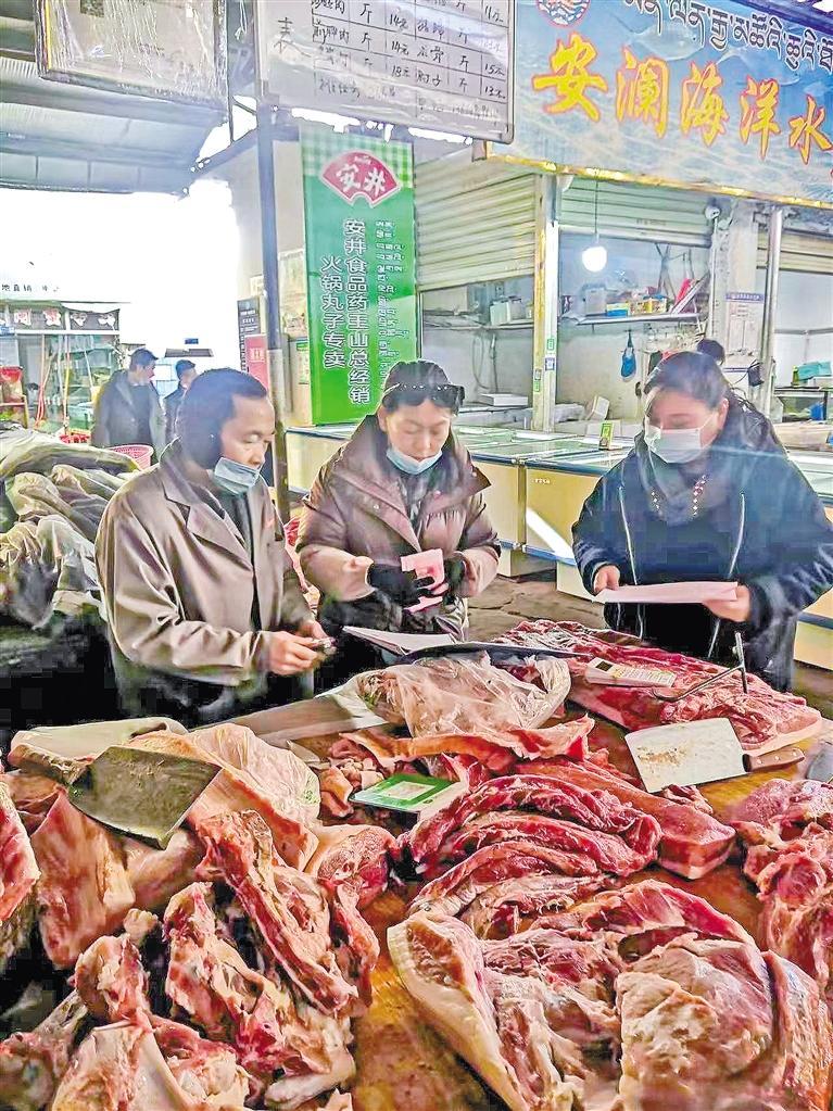 圖為拉薩市有關(guān)工作人員深入市場,查看糧油菜肉蛋奶等商品價格、供應情況。