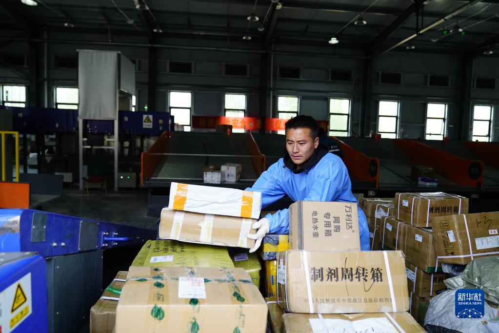 在中國郵政集團有限公司山南市分公司郵件處理中心,員工正在裝運快遞。新華社記者 劉洪明 攝