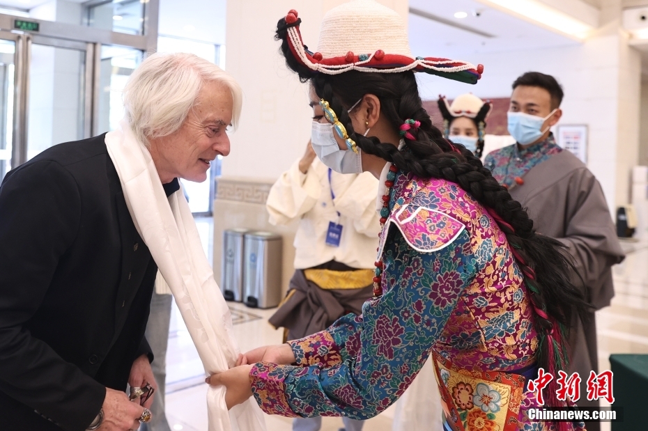 5月23日,“2023·中國(guó)西藏發(fā)展論壇”在北京舉行。會(huì)場(chǎng)外,活潑獨(dú)特的藏式迎賓舞蹈、展示西藏人文自然風(fēng)貌的圖片,已在論壇開幕前預(yù)熱起探討西藏新發(fā)展的氛圍。圖為著名紀(jì)錄片導(dǎo)演、全球化智庫(kù)(CCG)高級(jí)研究員龍安志(Lawrence Brahm)接受哈達(dá)。