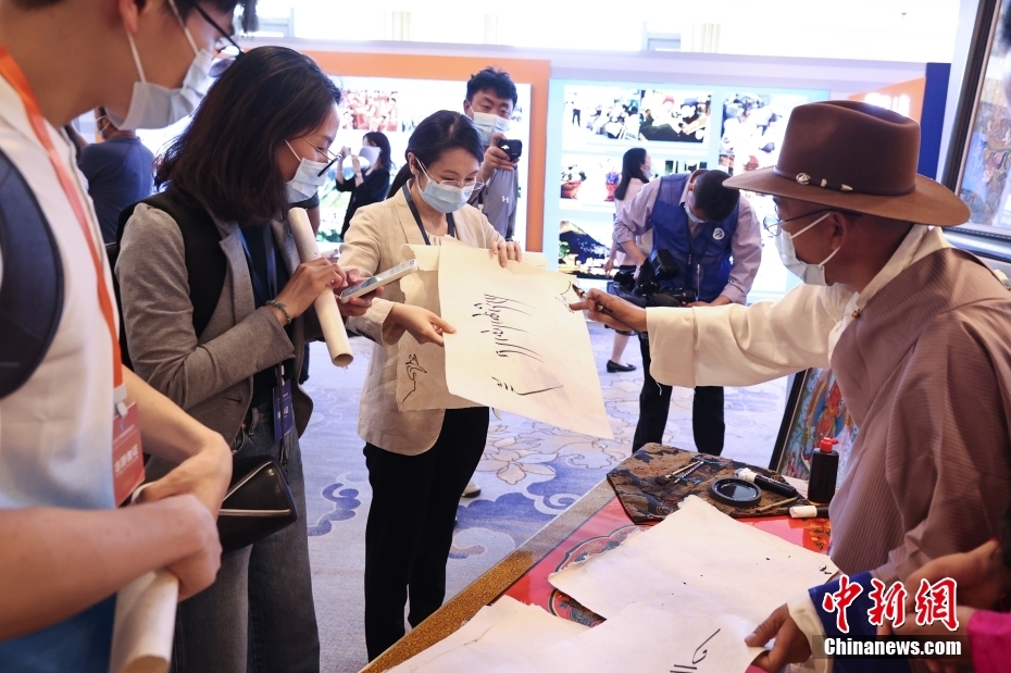 5月23日,“2023·中國(guó)西藏發(fā)展論壇”在北京舉行。會(huì)場(chǎng)外,活潑獨(dú)特的藏式迎賓舞蹈、展示西藏人文自然風(fēng)貌的圖片,已在論壇開幕前預(yù)熱起探討西藏新發(fā)展的氛圍。圖為藏族藝人現(xiàn)場(chǎng)進(jìn)行藏文書法創(chuàng)作并將作品贈(zèng)送給來賓。