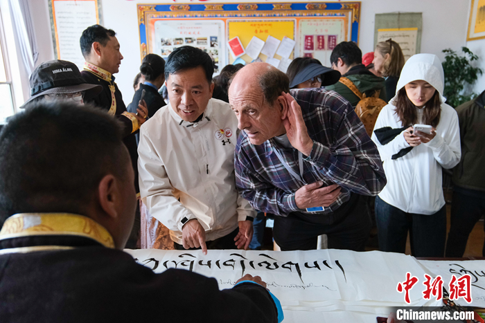 圖為5月18日上午,參訪團(tuán)成員柯馬凱(Michael Crook)側(cè)耳傾聽(tīng)藏文書(shū)法老師的講解。中新社記者 江飛波 攝