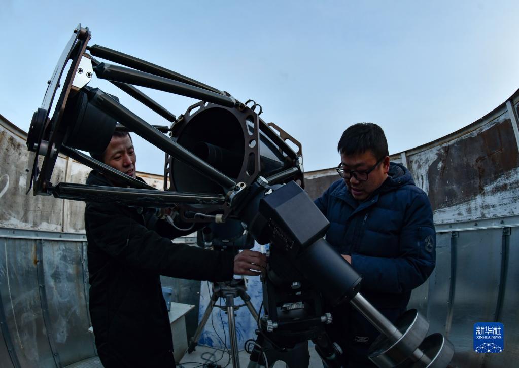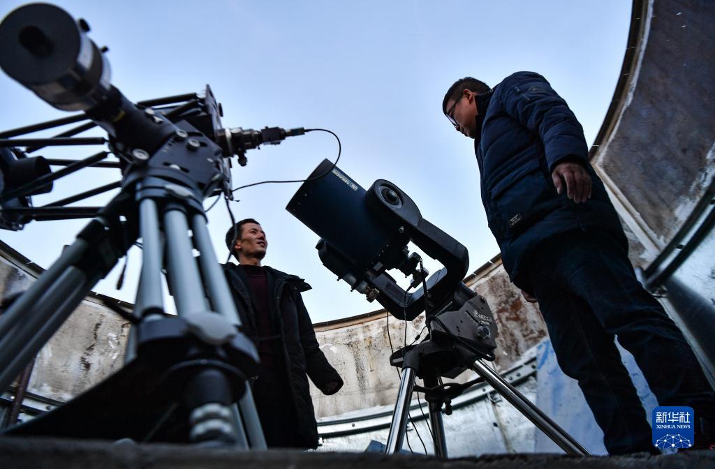 尤顯龍(左)和同事唐鵬在調(diào)試望遠(yuǎn)鏡(5月23日攝)。新華社記者 晉美多吉 攝