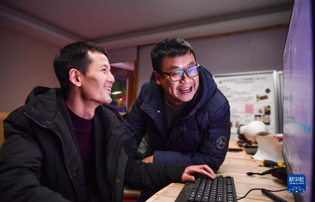 尤顯龍(左)和同事唐鵬在討論觀測(cè)到的數(shù)據(jù)(5月23日攝)。新華社記者 晉美多吉 攝