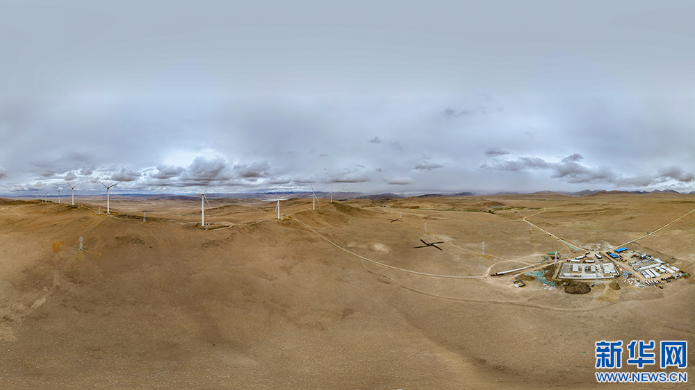 6月9日拍攝的西藏措美哲古風(fēng)電項目風(fēng)電機(jī)組和西藏措美哲古風(fēng)電廠(無人機(jī)全景照片)。新華網(wǎng) 旦增努布 攝