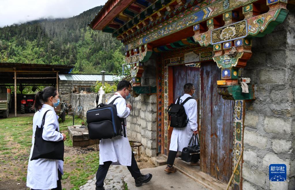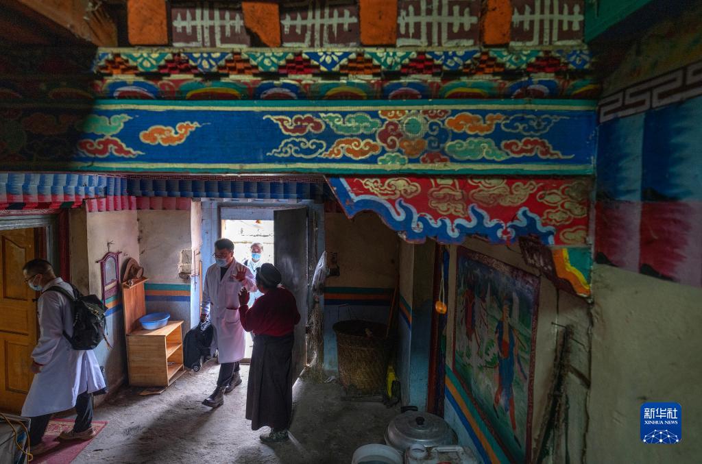 6月12日,王振疆(右一)和尼瑪益西(右下)在吞不絨村為阿珍診治。新華社記者 費茂華 攝