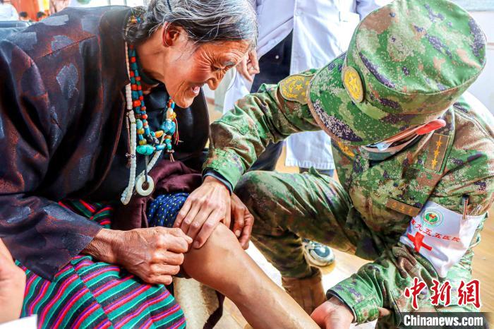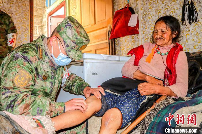 圖為醫(yī)療隊(duì)軍醫(yī)來(lái)到格桑措姆老人的家中為她檢查膝蓋疼痛問(wèn)題?!≈煳男?攝
