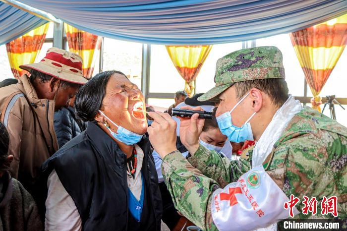 圖為醫(yī)療隊(duì)軍醫(yī)為村民進(jìn)行口腔檢查?!≈煳男?攝