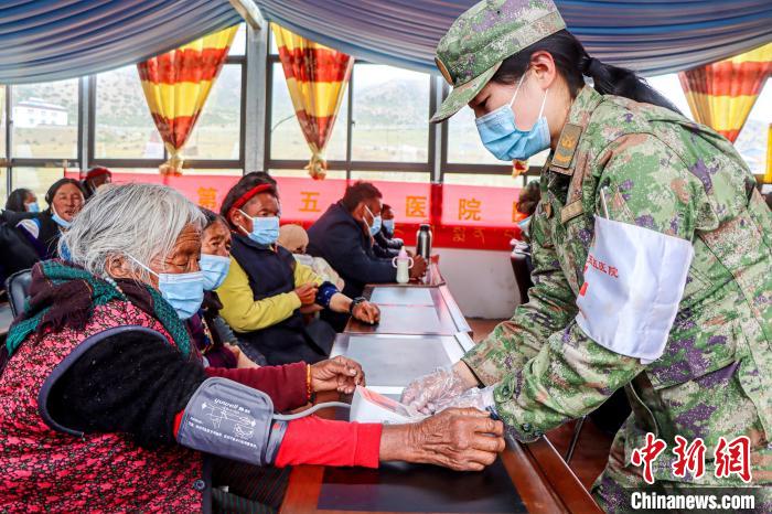 圖為醫(yī)療隊(duì)軍醫(yī)為村民測(cè)量血壓?!≈煳男?攝