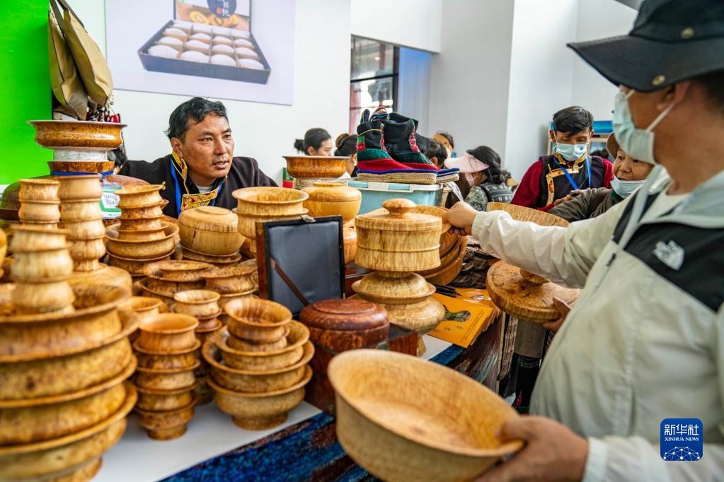 6月17日,工作人員在第五屆藏博會現場為顧客介紹木碗產品。新華社記者 孫非 攝
