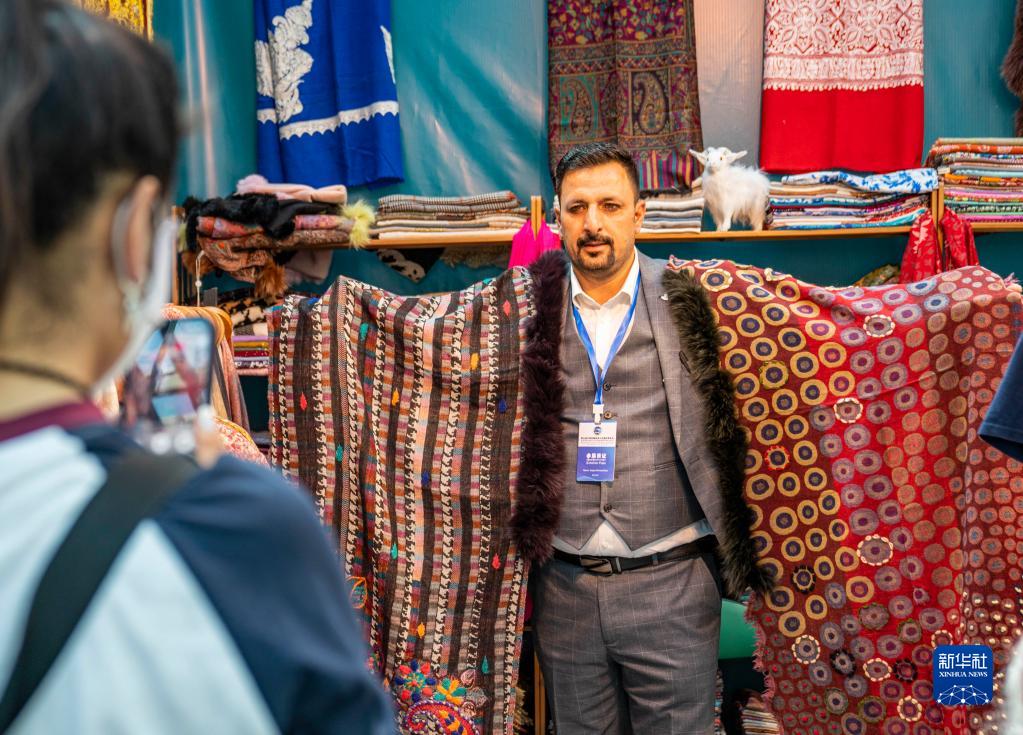 6月17日,來自印度的參展商在第五屆藏博會現場向顧客展示披肩。新華社記者 孫非 攝