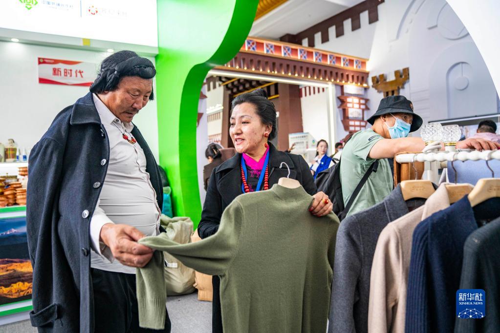 6月17日,工作人員在第五屆藏博會(huì)現(xiàn)場向顧客介紹產(chǎn)自阿里地區(qū)的羊絨衫產(chǎn)品。新華社記者 孫非 攝