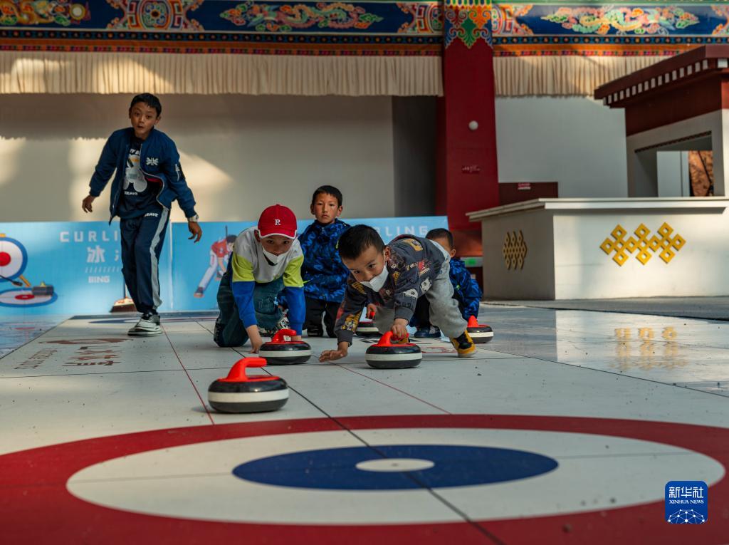 6月17日,幾名孩子在第五屆藏博會(huì)現(xiàn)場體驗(yàn)冰壺。新華社記者 張汝鋒 攝