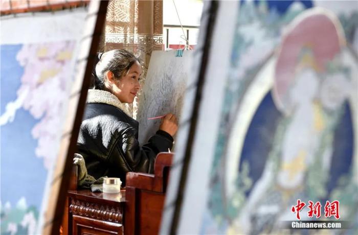 索朗次旺在西藏拉薩繪制唐卡。隨著社會(huì)的發(fā)展,越來(lái)越多的西藏女性學(xué)習(xí)唐卡繪畫。李林 攝