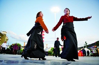市民在湖南援建的山南市體育館廣場(chǎng)上跳鍋莊舞。攝影:辜鵬博(湖南日?qǐng)?bào)攝影記者)