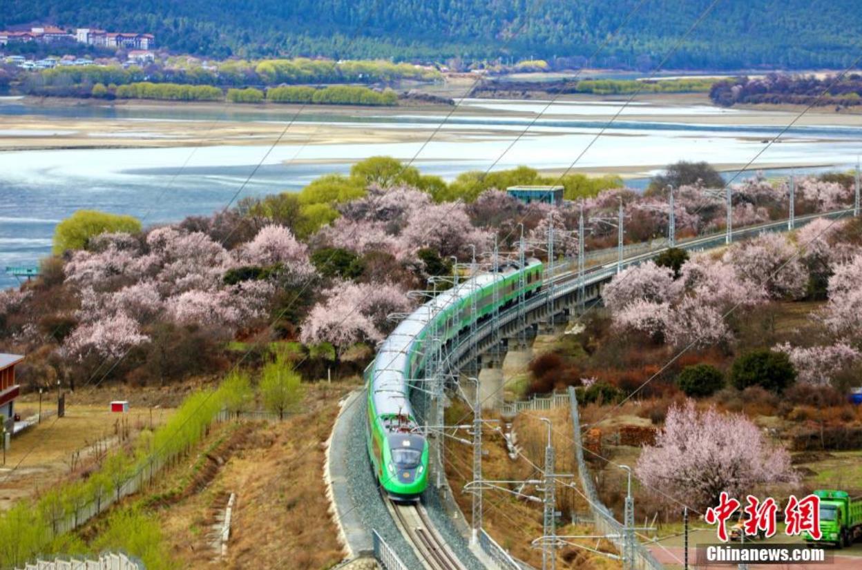 資料圖:桃花、嫩柳與國槐綠涂裝的高原復(fù)興號。 馬生明 攝