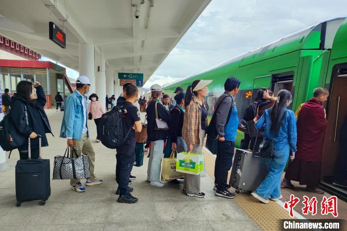 圖為暑運(yùn)期間,旅客在日喀則火車站乘坐高原復(fù)興號(hào)。拉薩車務(wù)段 供圖