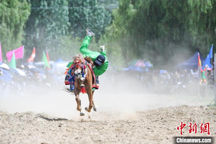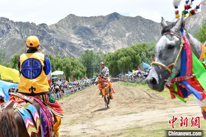 7月24日,在西藏自治區(qū)拉薩市曲水縣曲水鎮(zhèn)茶巴朗村村民身著節(jié)日盛裝進行賽馬和馬術(shù)表演歡度“望果節(jié)”?!巴?jié)”已有1500多年的歷史,是國家級非物質(zhì)文化遺產(chǎn),流行于西藏拉薩、日喀則、山南等地。