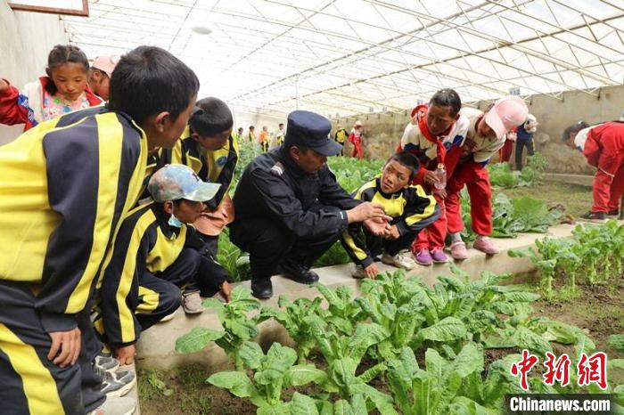 圖為民警為巴嘎鄉(xiāng)小學(xué)生科普溫室大棚種植技術(shù)。西藏出入境邊防檢查總站阿里邊境管理支隊供圖