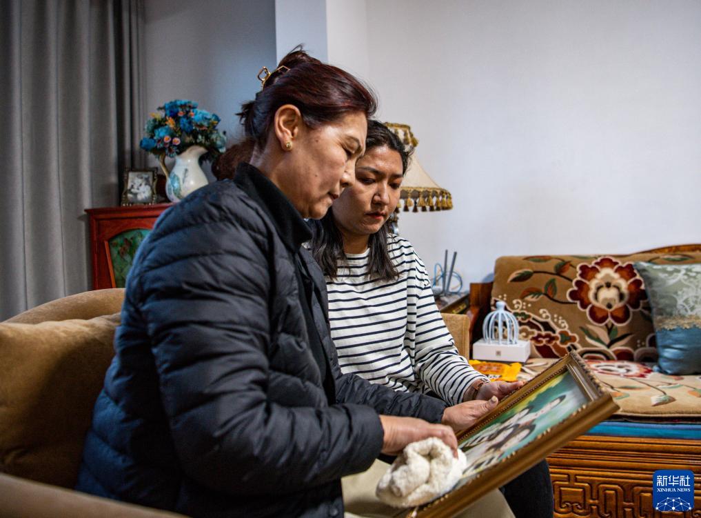 在位于西藏拉薩市的家中,邊巴的妻子卓嘎(左)和女兒次珍擦拭全家合影(2023年5月4日攝)。新華社記者 孫非 攝