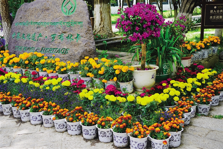 雪頓節(jié)除了看藏戲、賽馬等傳統(tǒng)表演之外,人們也喜歡到羅布林卡觀賞花卉。近期,記者走訪羅布林卡時發(fā)現(xiàn),園內(nèi)花團(tuán)錦簇、游人如織,大部分宮殿及人流量較大的道路上已擺放好了盆栽。園區(qū)道路間擺放的盆栽花卉主要有繡球花、萬壽菊、金魚草、波斯菊、高雪輪、麥稈菊等,而宮殿前擺放的花卉主要有一品紅、繡球花、萬壽菊等。