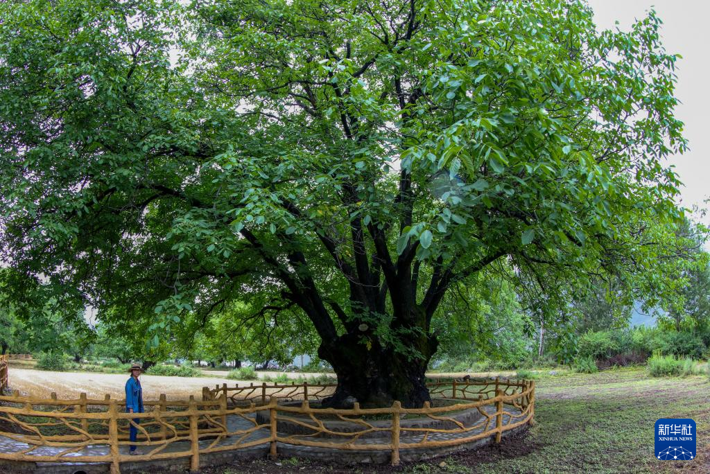 劉利平在加查縣查看一株樹齡1800余年的古核桃樹(7月27日攝)。新華社記者 旦增尼瑪曲珠 攝