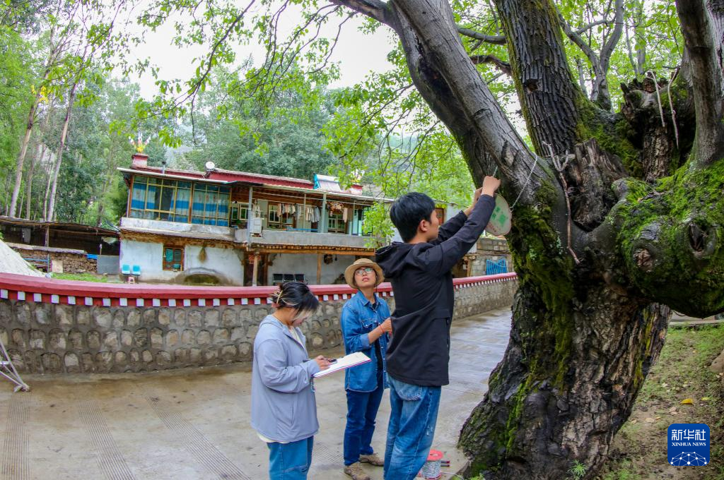 劉利平(左二)在加查縣安繞鎮(zhèn)熱果村指導(dǎo)學(xué)生給一株古核桃樹掛牌(7月27日攝)。新華社記者 姜帆 攝