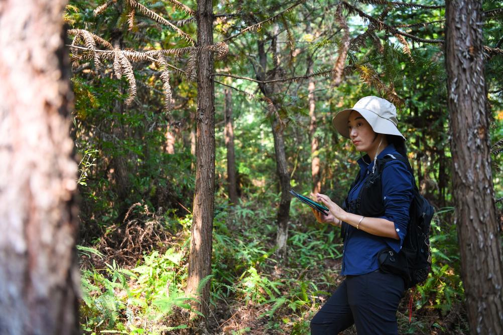 2022年9月22日,白拉曲珍在廣東韶關(guān)樂昌市張溪村生態(tài)監(jiān)測(cè)樣地工作。新華社記者鄧華 攝